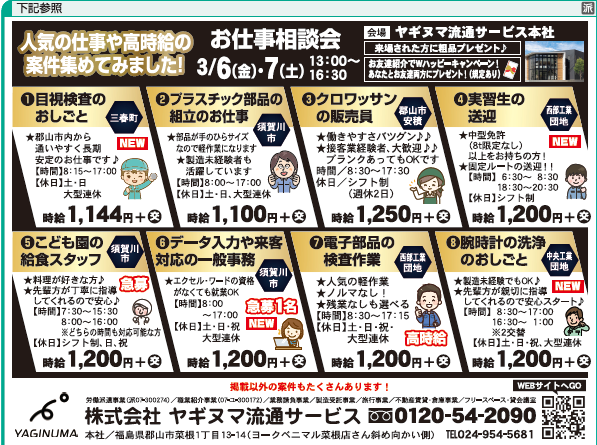 - お仕事説が開催されます! 会場:ヤギヌマ流通サービス本社 日付:3/6(金)、3/7(土) 時間:13:00~16:30 たくさんのご来場お待ちしてお…