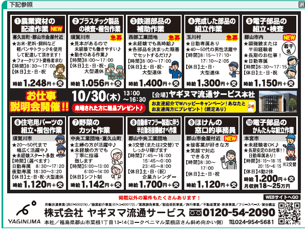 - お仕事説明会が開催されます! 会場:ヤギヌマ流通サービス 日時:10月2日(木) 13:00~16:30 たくさんのご来場お待ちしております!! 画像…