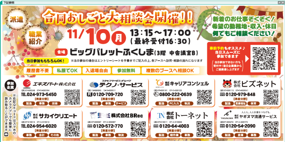 - 11/10(月)13:15~17:00、ビッグパレットふくしまにて合同説明会が開催されます! 多種多様な案件を取り揃えておりますので、<履歴書不…