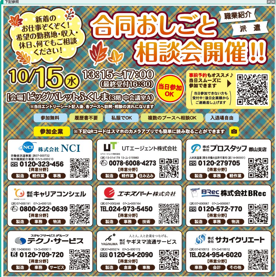 - 10/15(水)13:15~17:00、ビッグパレットふくしまにて合同説明会が開催されます! 多種多様な案件を取り揃えておりますので、<履歴書不…